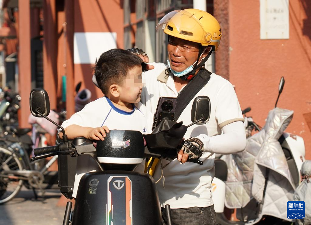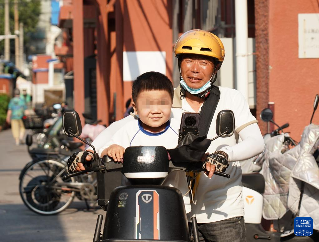 7月22日,送餐回來的孟世祥陪同孩子遊玩。新華社記者 張晨霖 攝