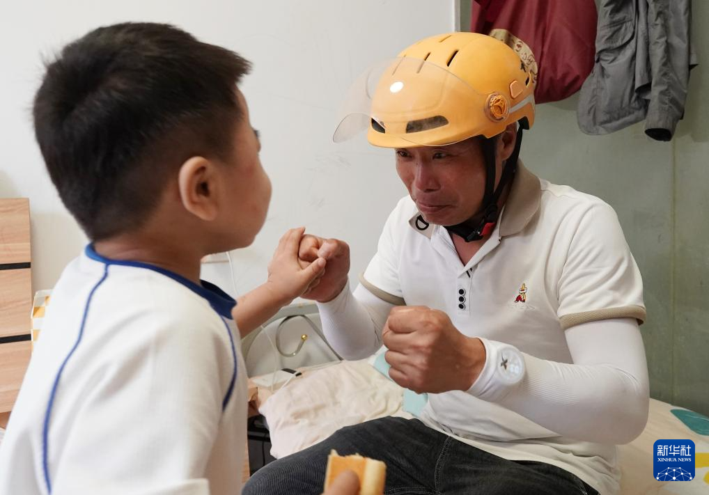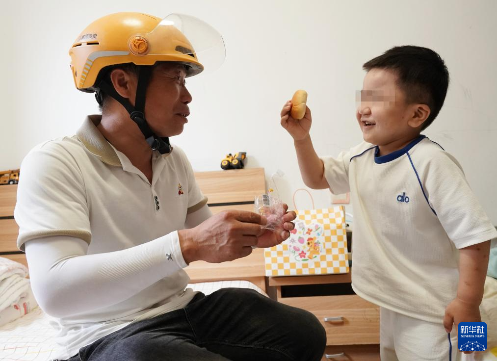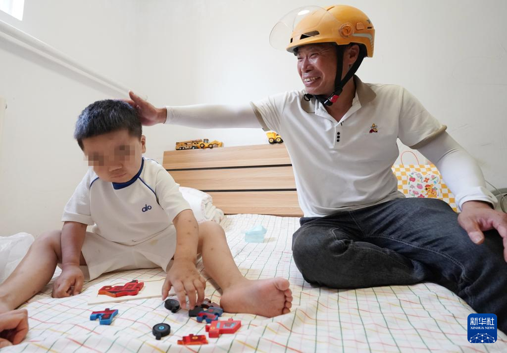 7月22日,孟世祥在訂單空閑時回家陪同小兒子。新華社記者 張晨霖 攝