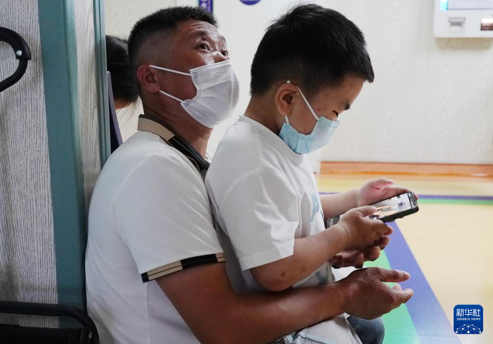 7月24日,孟世祥帶著小兒子包養網在首都醫科年夜學從屬北京兒童病院眼科等待復查。新華社記者 張晨霖 攝