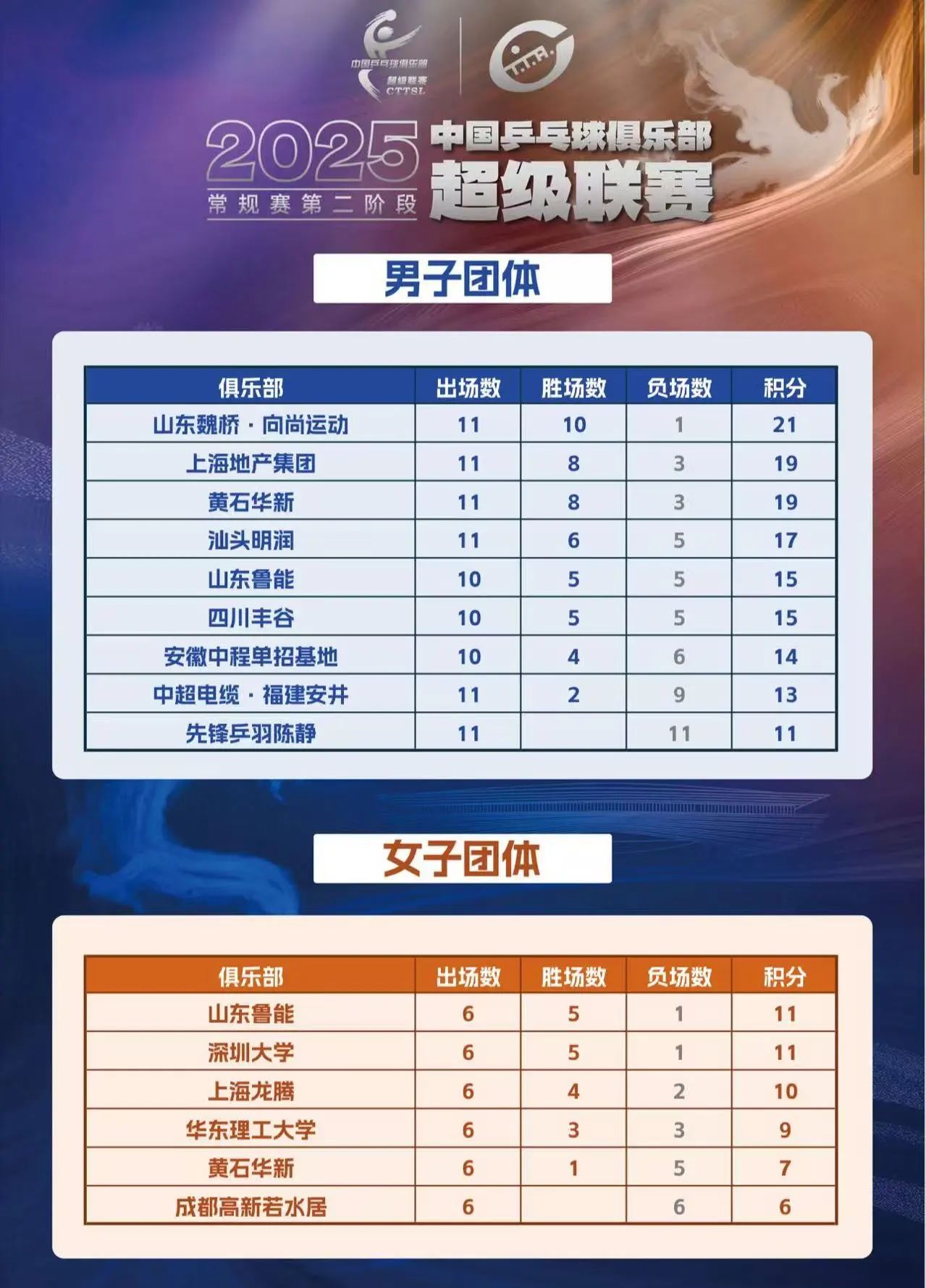 第二階段過后,男團方面山東魏橋·向尚活動、上海地產團體、黃石華新、汕頭明潤占據前四位,女團方面山東魯能、深圳年夜學、上海龍騰、華東理工年夜學占據前四位。